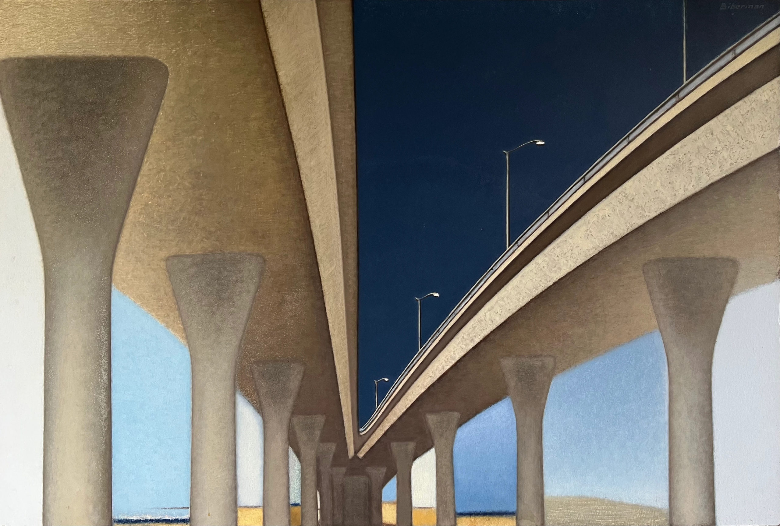 I continued along, struck by the way each painting captured subtle variations in the tenor of California’s mid-century built environment. I paused a while at Freeway Divide, another geometric mood piece from 1960. Two parallel concrete overpasses met at the center of the canvas; every one of the support columns sectioned off a windowpane-like space of blue, every pane a different shade. The whole painting was at once ecclesial and unholy. It was time to find Chris Walther, of CW Modernism, who’d put "the Architectural World of Edward Biberman" together.