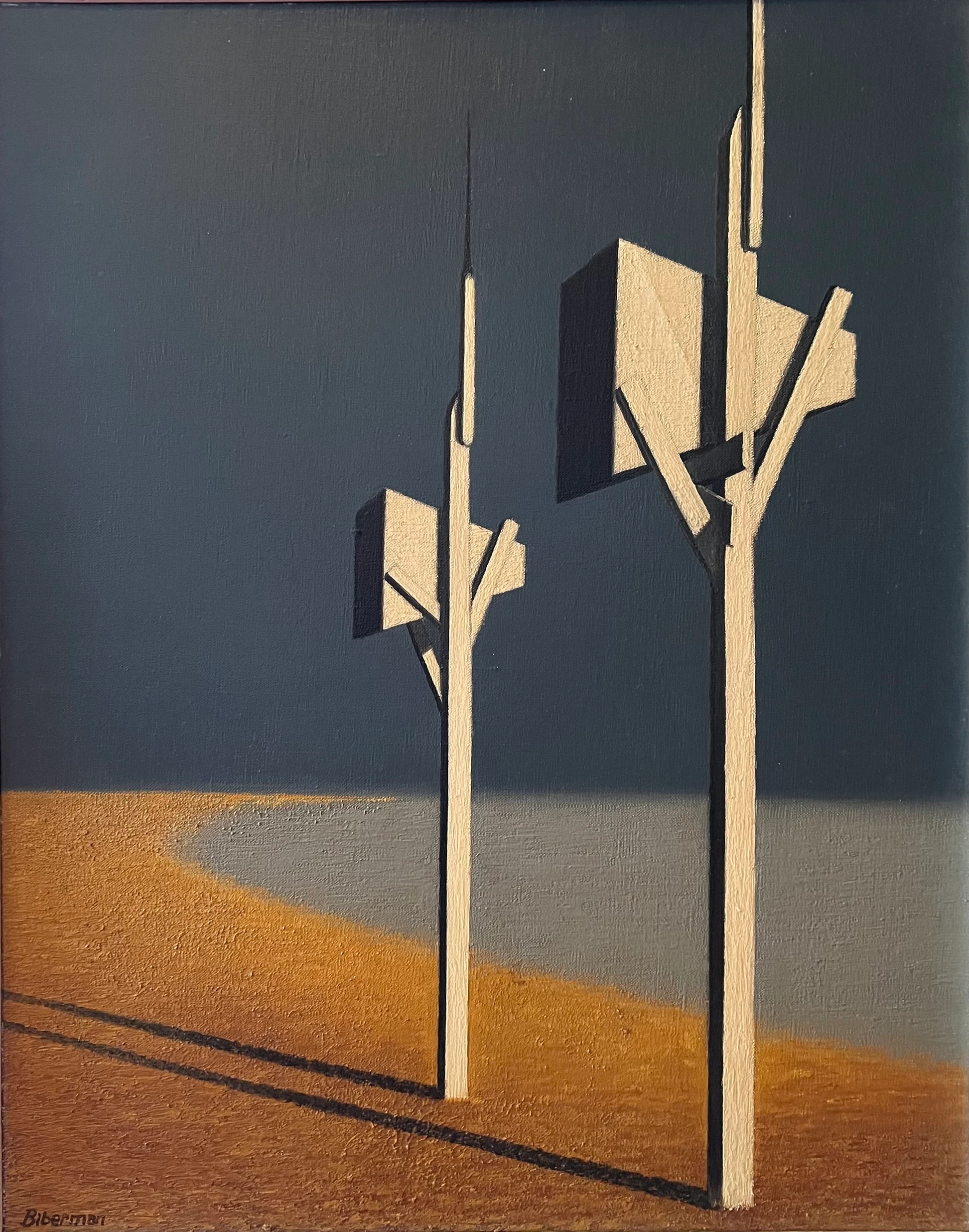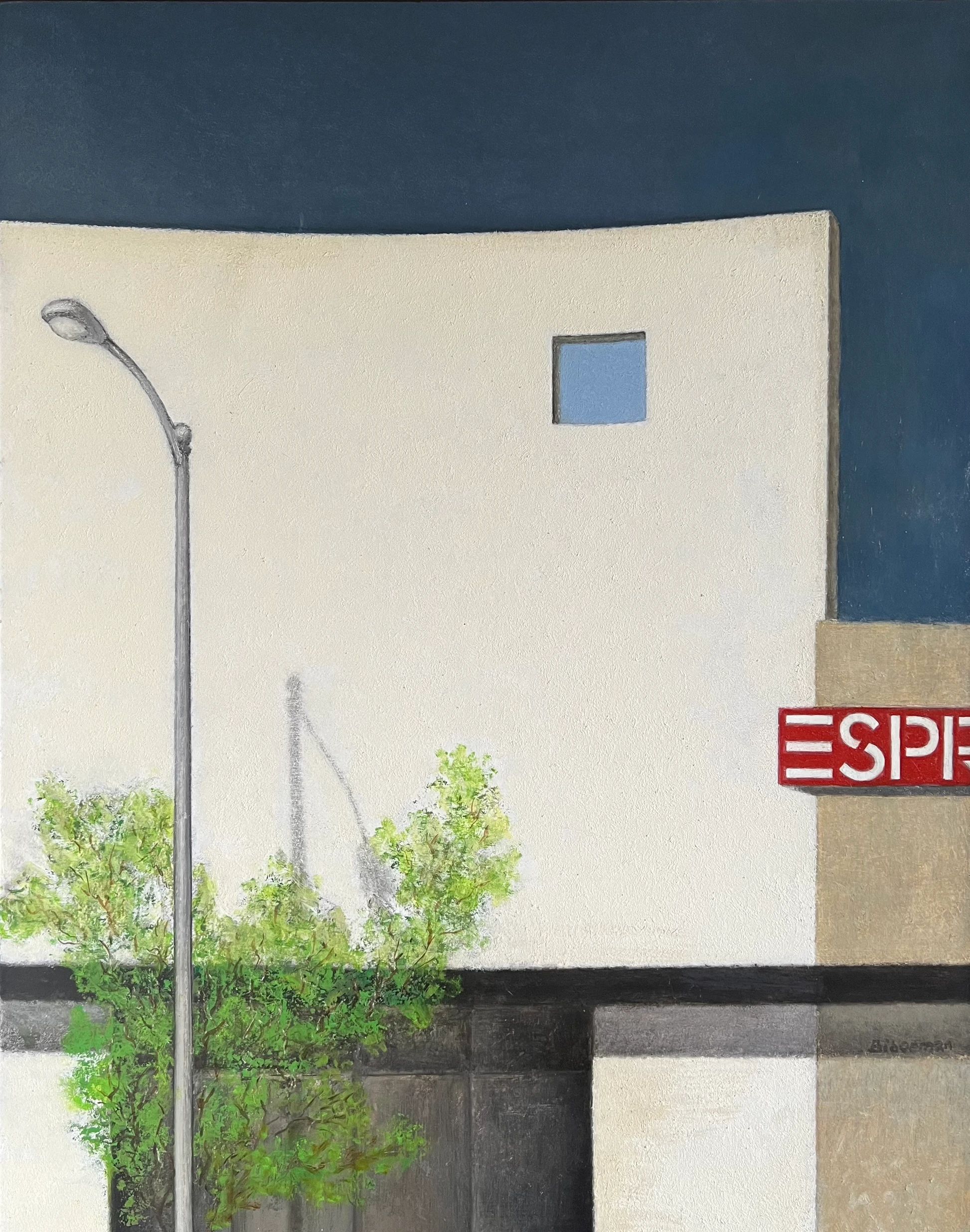 I parked just past my destination, across from a house where disgraced Universal Studios head, “baby boss” Carl Laemmle, Jr., lived in seclusion until his death in 1979. After lingering in my car to listen to the rest of an NBA playoff game while looking out at a sun-soaked canyon, I walked back down the road to the only open door on the block, greeted by the delicate hum of a small reception. Throughout, the off-white interior wore the Bibermans like a dame inseparable from her jewels, the walls clearly accustomed to the works of masters. Pairs and small groups of people middle-aged and older took in the spare, oil-on-canvas depictions of SoCal urbanism from the foyer through the dining room to the lounge and back again. Outside, more people gathered on the terrace and in the tree-lined garden which looked out to the smoggy sprawl in the distance rising out of the earth like some sullen mirage.
