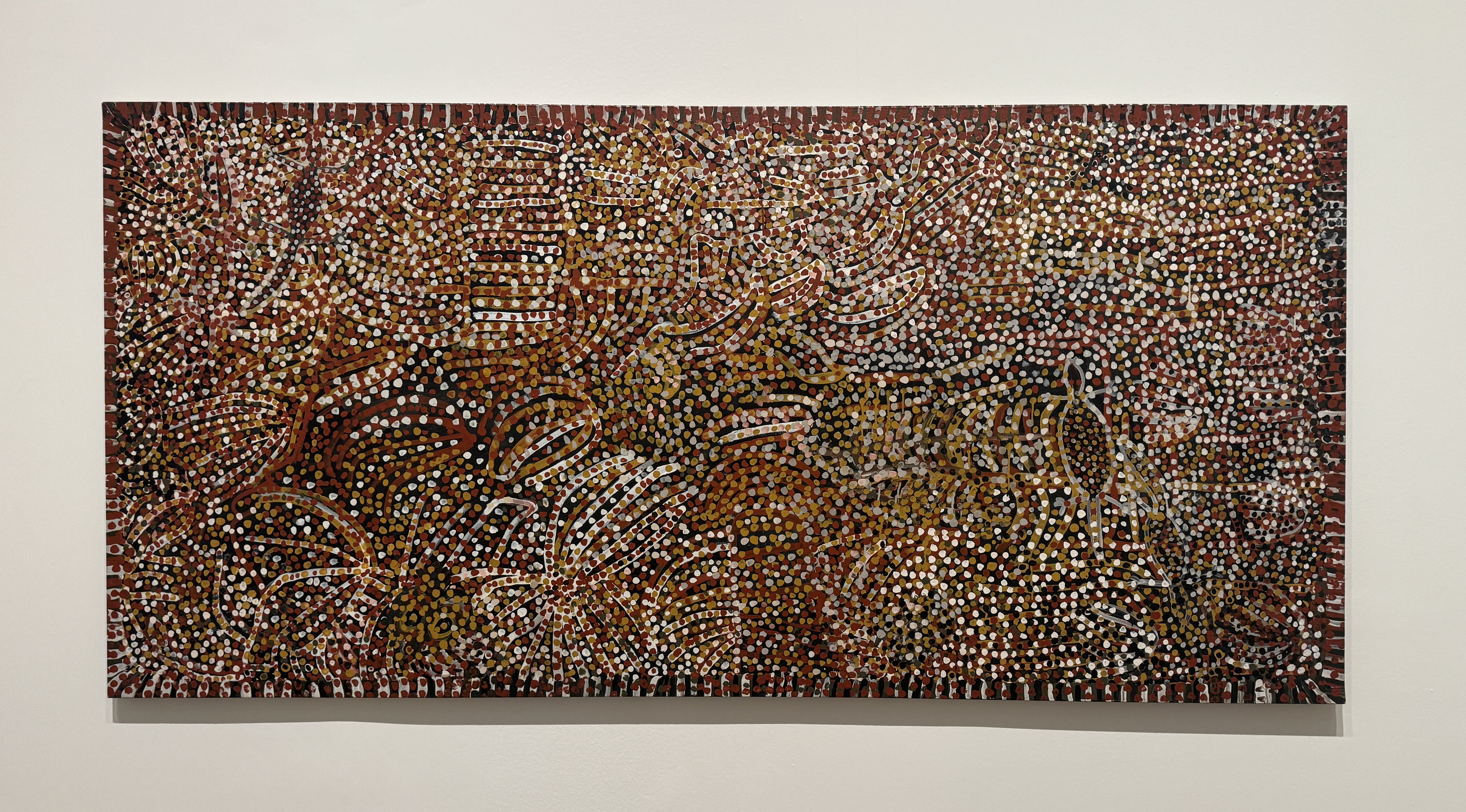 I found Wild Yam VI (1996) in the last room of the exhibit, a large canvas with lines, mostly white and yellow with bursts of pink and purple, running over a black background. As the title suggests, the painting marked something of a return for Kngwarray, “an intentional and repetitive assertion of her identity.” Her entire oeuvre consists of an acute resistance to colonization and simultaneously acts as a love story to her people, her Country. Her work is about identity, yes, but a collective one. Individual identity meant very little to her.