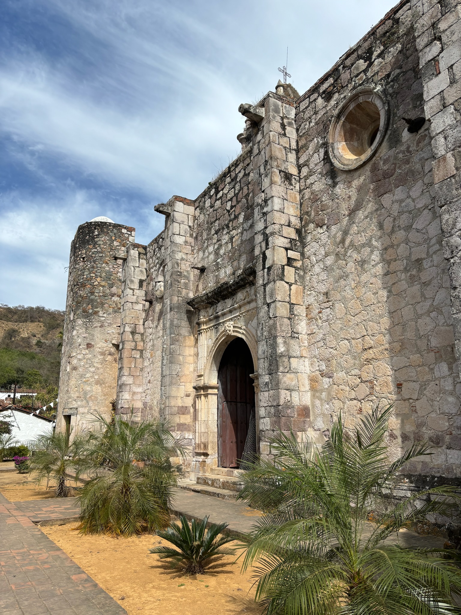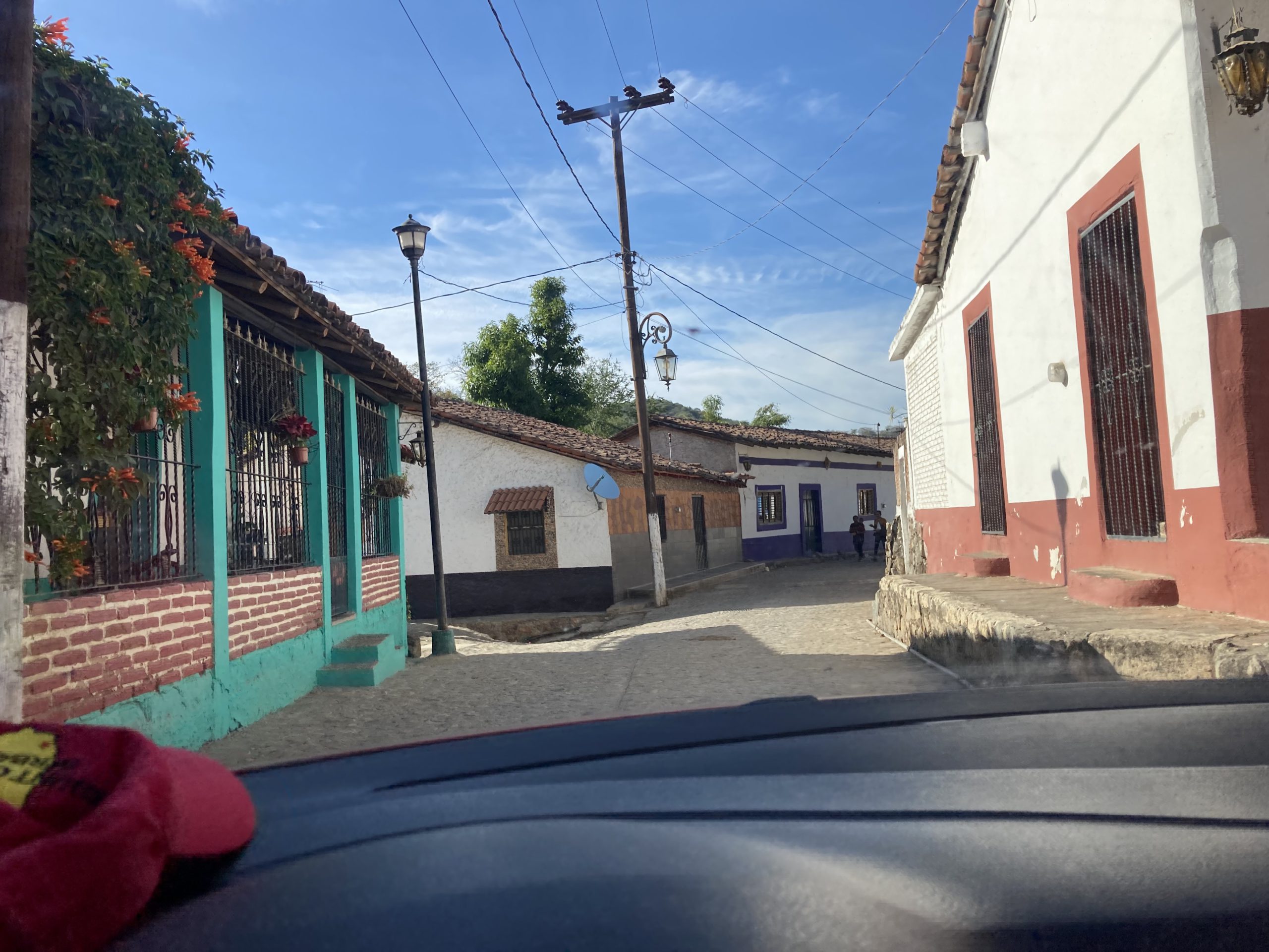 We drive to Copala, a silver mining town that dates back to 1565 in the municipality of Concordia, 610 meters up into the Sierra Madres. We get lost a couple times due to discrepancies between the “smart" phone’s directions and veritable, extant roads. (We also pay over 300 pesos in various tolls.) We pass elaborate, decorous mountain cemeteries festooned with plastic flowers and multi-colored gravemarkers. In Copala, only the sounds of roosters, birds, people’s voices in backyards, a distant cowbell. Stillness and heat, bougainvillea, cacti, palms. San José de Copala, the stone church at the head of the plaza, was built around 1765 by the Marquis of Panúco, Francisco Javier Vizcarra Moreno. The Spanish crown supplied 200 pounds of gold to adorn various facets of the edifice. Scant evidence remains.