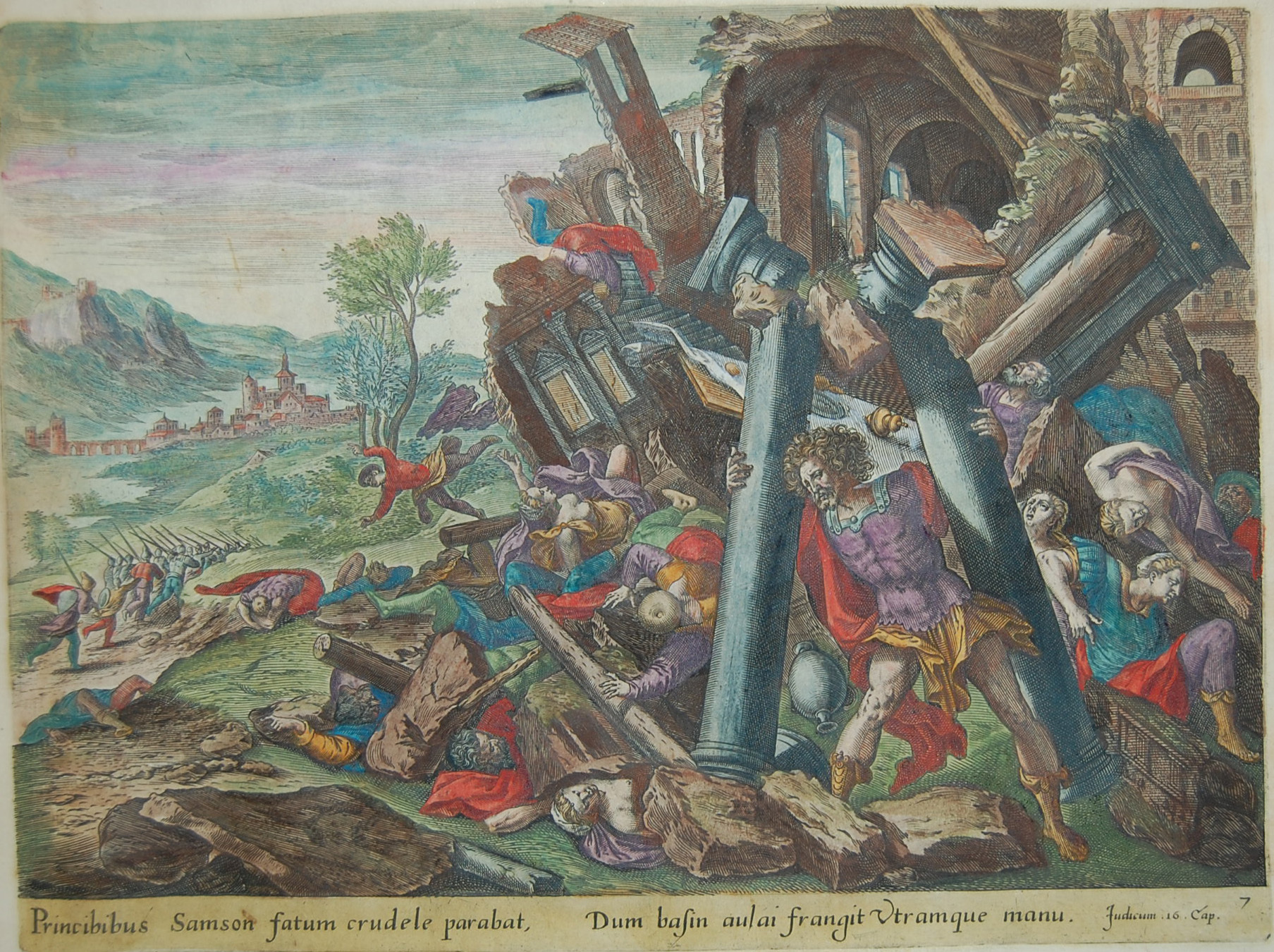 The Philistines predictably receive unfavorable notice in the notionally historical portions of the Old Testament, most famously in the stories of David and the Philistine giant, Goliath, and the judge Samson and his faithless wife, Delilah. The latter is retold by Milton in Samson Agonistes (1671), which begins with the Israelite hero “eyeless in Gaza,” but recovering his strength in time to pull down the temple on the Gazans who have made a spectacle of his captivity: “The Edifice where all were met to see him / Upon their heads and on his own he pulled.” Milton’s poem ends with Samson’s father, Manoa, resolving to recover his body, “soak’t in his enemies’ blood,” for burial. A local tradition, told to Liebling on his one visit, said that Samson survived long enough to carry the fallen pillars of the temple “to the far end of the crest of Ali Muntar, where admiring posterity has erected a marabout,” i.e., a shrine, “as a marker.”