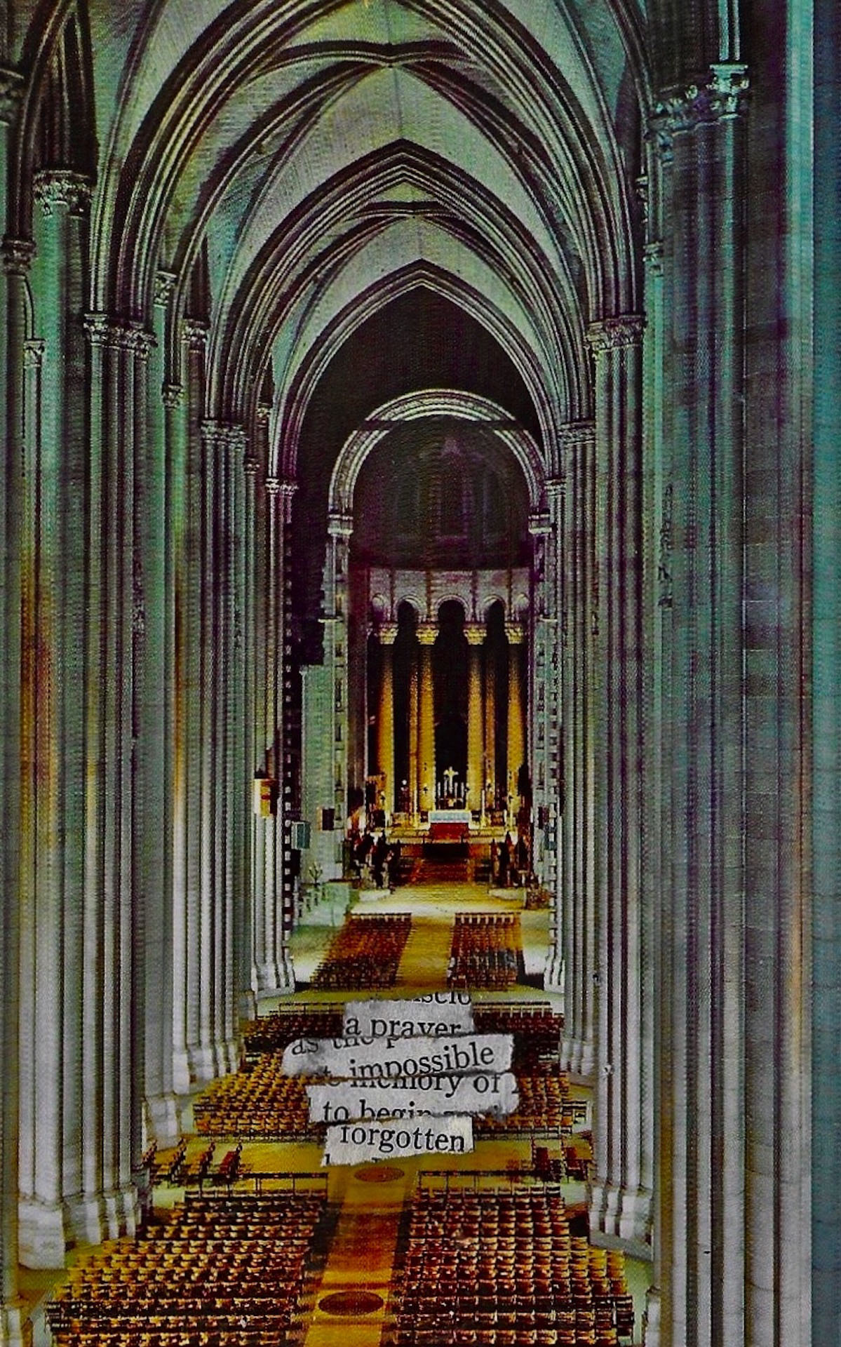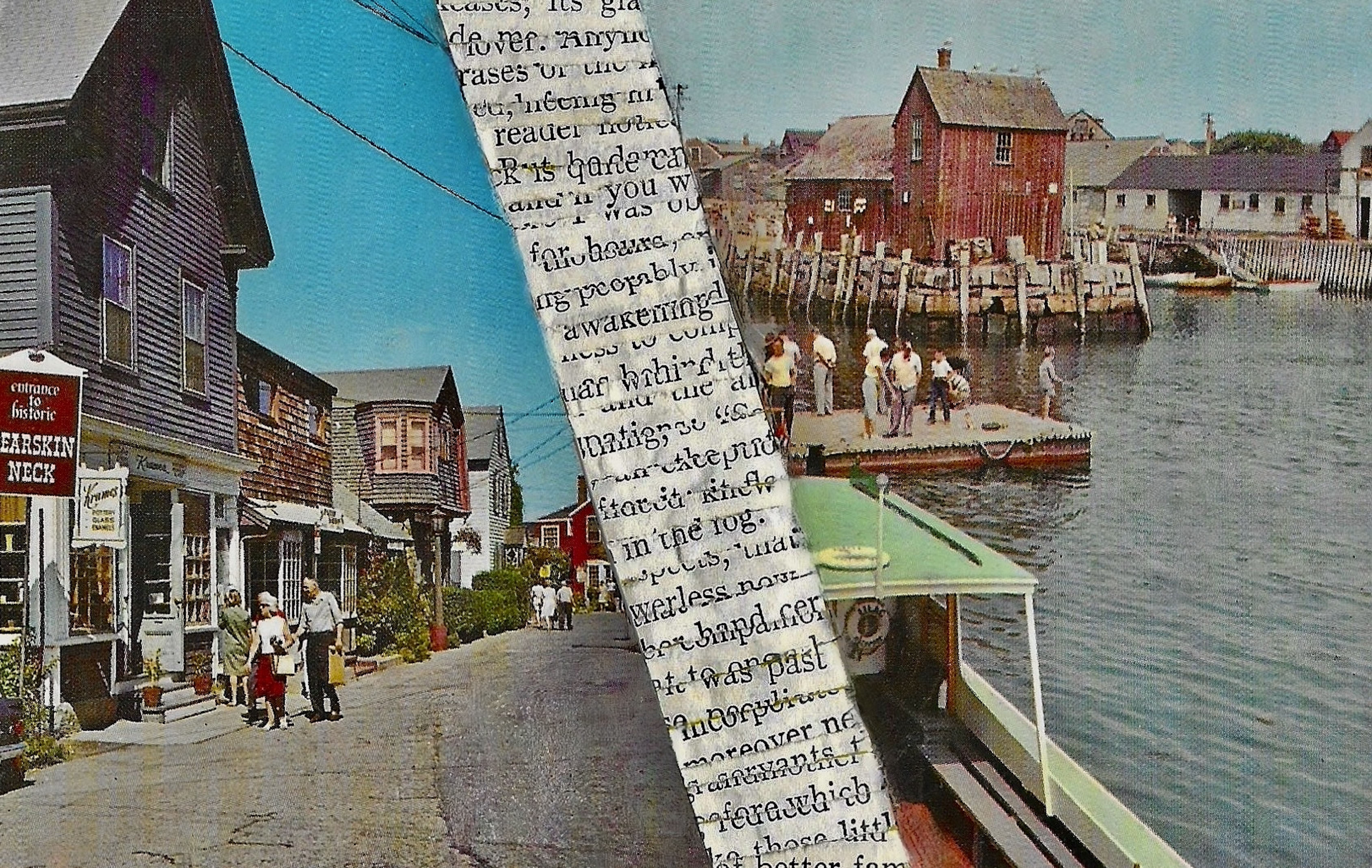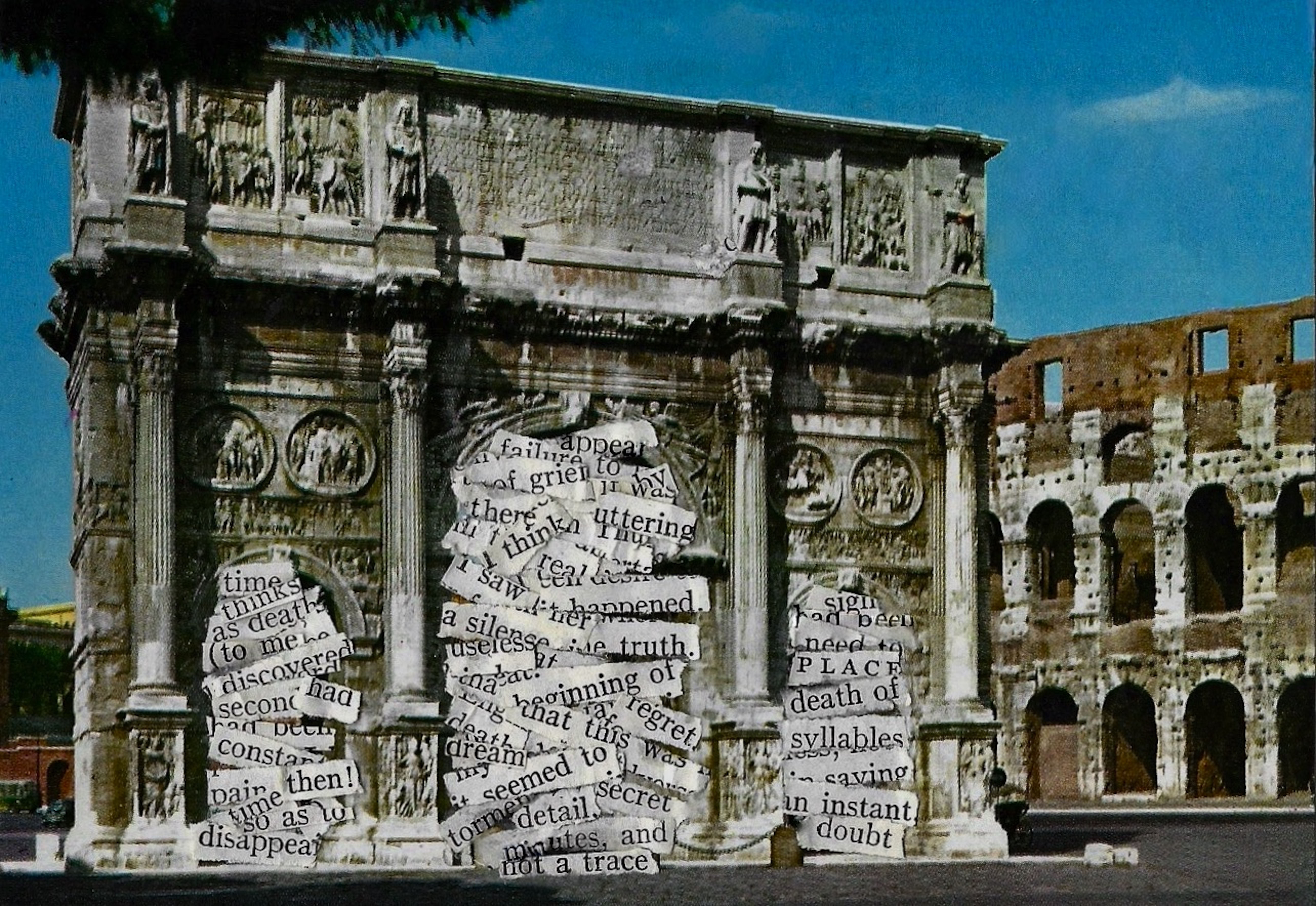 My PostCardPoem series arose from the discovery of my deceased father’s large collection of vintage travel postcards. Around the same period, I happened upon (largely by accident) ways in which small fragments from a copy of Marcel Proust’s Remembrance of Things Past (shredded for another project that I was working on) could be evocatively placed directly on the postcards—glued into the image. As a kind of clandestine caption, or as a fissuring mark of dislocating intervention, Proust’s fragmentary lines of language were suddenly seen as if commenting upon their estranged new setting.