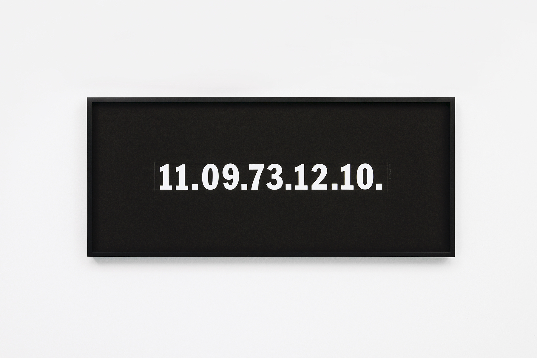But you mentioned this piece, 11.9.73.1210, which I made when I was starting my studies of architecture. I had discovered Letraset, those plastic letters used to mark floor plans and drawings. They sell sheets of these letters in different sizes. And you glue them with a little instrument on your floor plans. I discovered these letters and I was in love with them. I was playing with them. So a year after the coup, I had this black cardboard on my desk, and I thought, I’m going to play with Letraset. And I thought, I’m going to put the date of the coup, which marked my life, which changed my life. So I put 11 September 1973. And when I finished, I felt that first it wasn’t dense enough, it was too simplistic. It was good for me because it was a reminder of what changed my life, but I wanted something more. Instead of cutting the board, I thought it would be nice to add something to make it symmetrical. I thought, I’m going to put the time of the first bomb that destroyed the Moneda Palace, which was the presidential palace. And that was at 12:10. So then it became 11 September 73, 12:10, which is an even more precise moment when the catastrophe started, when the first bomb fell on La Moneda.