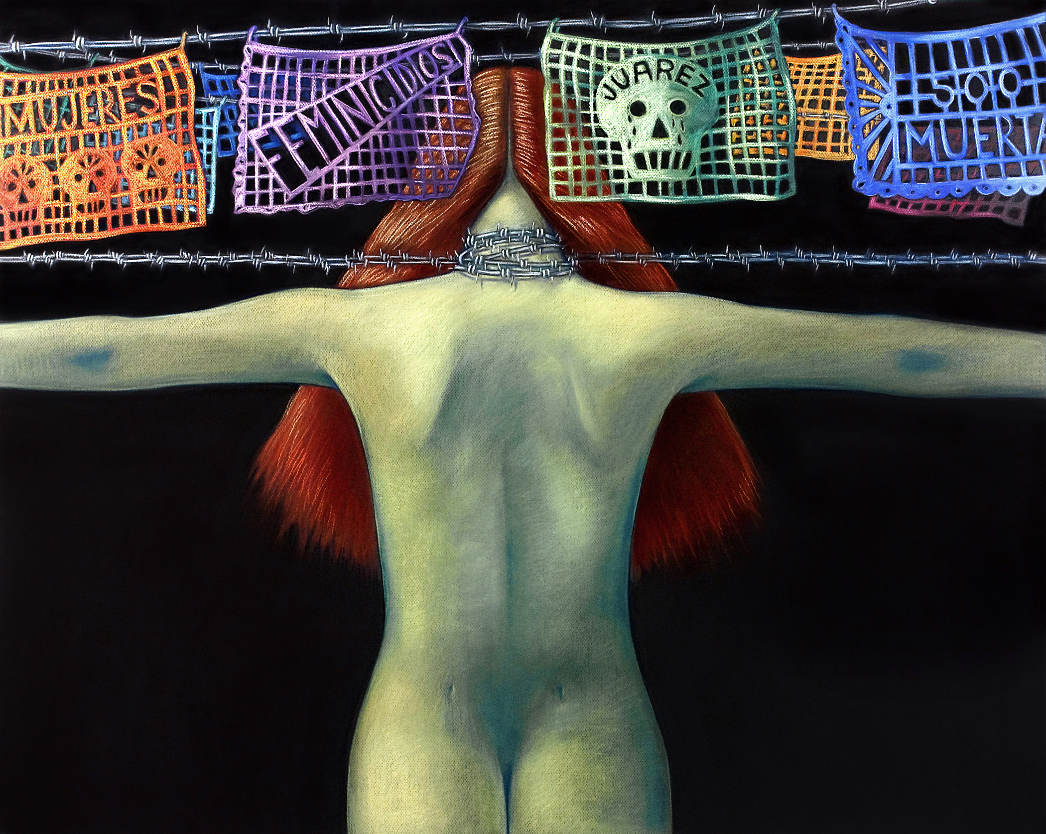 It depends on the piece. But the “Juarez” series is a reminder that young women are easy targets at the factories where they work, much like the women sacrificed by the ancient cultures of Mesoamerica. The mask represents the continuum of the brutalization of women, that women are expendable—from the Aztecs, the Mayans, the Spanish, to contemporary Mexico. Women have always paid a high price.