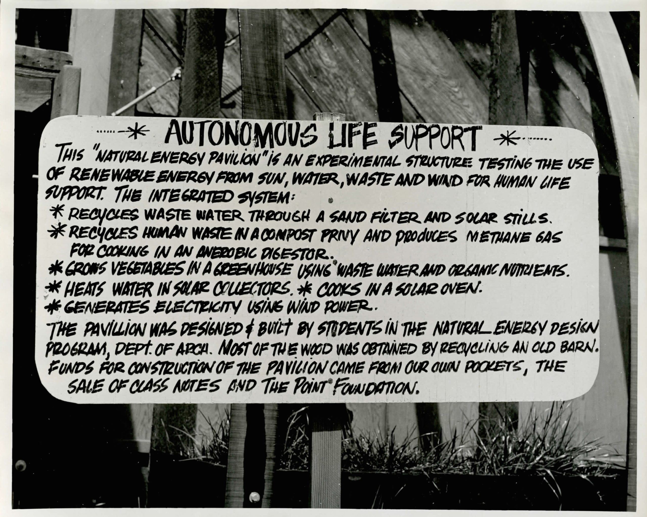 It had been only nine years since the revelation of Rachel Carson’s Silent Spring, three years since the creation of the Environmental Protection Agency, one year since the passage of the Clean Water Act, and the Endangered Species Act was only months away from being enacted in Congress, as they built the Energy Pavilion. And while no one knew what they were doing when it came to protecting the planet, many, like Van der Ryn, Campe, and their students, felt the need to do something, to experiment, to play with new ways of building and living on the planet.