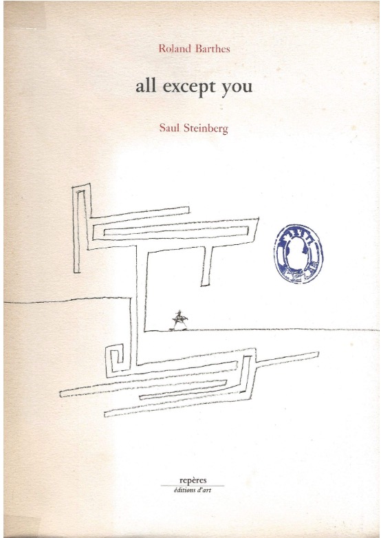 Barthes wrote a book on this universe, posthumously published as all except you in French in 1983. Strangely, the text never appeared in English—until now. Translated and with a commentary by Joe Milutis, all except you (punctum books) shows the mind of a master semiotician at work on a cartoonist whose line defined a generation of New Yorker cartoons in the 20th Century. Written in the same “fragments” that Barthes honed in books like A Lover’s Discourse (1977), the text longs for the words to describe the language of Steinberg’s drawings. Ultimately, this longing fails: Steinberg’s “system,” Barthes concludes, is “inexhaustible.”