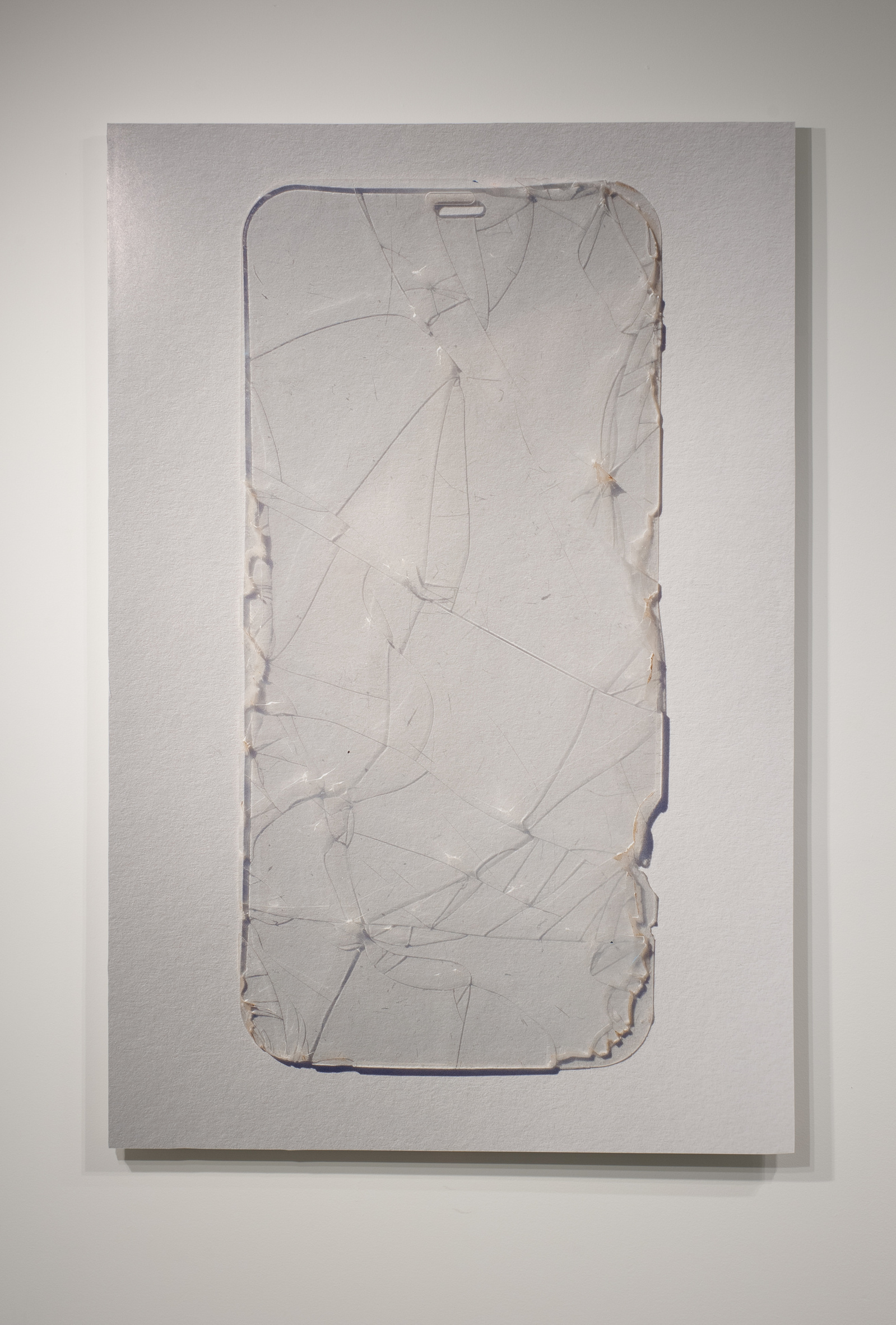 Peel the protector off the phone, take a photo of it, blow it up, print it, and hang it on the wall. That’s what Graham Littell has done in “I, Phone,” his latest solo show. He’s done it eight times with eight glass protectors and the effect is fantastic: If you walked inside the Schmidt Gallery at Principia College last month, you could have been in a cathedral with screen protectors for windows. Look in the windows and you would have found a lens into the life of the modern mind—broken, cracked, and confidently falling apart.